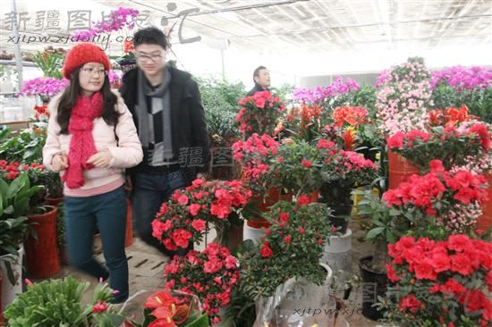 2013年2月6日,市民在花卉市场选购鲜花。随着新年的临近,新疆阿克苏市花卉市场开始热闹起来。