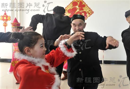 2013年2月1日,小朋友与福利院老人跳起哈萨克族舞蹈“黑走马”。当日,新疆哈密地区巴里坤哈萨克自治县组织该县大河镇30多名留守儿童,来到县福利院开展“给爷爷奶奶拜年”活动,与老人们共迎新春。