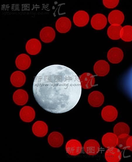 2013年2月24日晚,一轮明月与红灯笼相映成景。当日晚,哈密市上空一轮明月与五彩缤纷的灯饰,焰火相映成辉,给元宵之夜增添情趣。