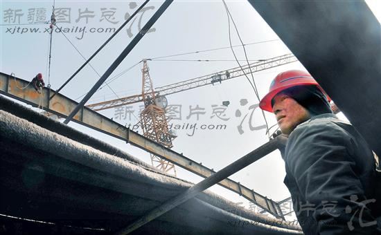 2013年1月8日,工人在新疆喀什综合保税区联检大楼施工现场施工。进入冬季,工程人员在该保税区的两座核心建筑——综合大楼及联检大楼建筑工地上通过搭建暖棚进行冬季施工。两座建筑预计4月封顶。