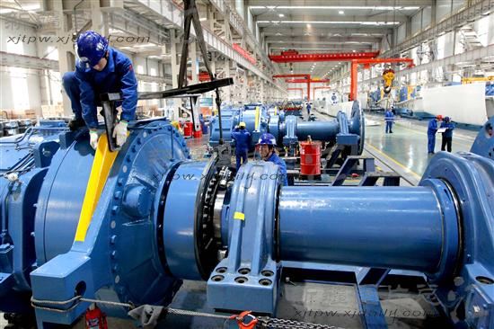 2013年12月5日,新疆哈密海装风电制造基地车间,工作人员在组装风电机组。
