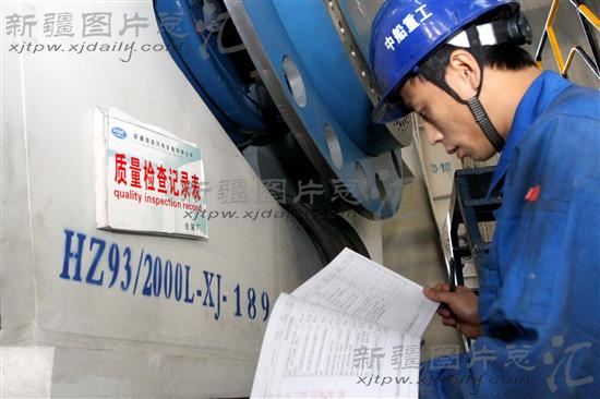 2013年12月5日,新疆哈密海装风电制造基地车间,质检人员在查看记录。