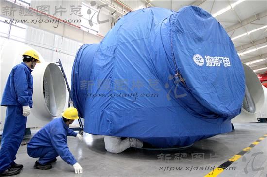 2013年12月5日,新疆哈密海装风电制造基地车间,工作人员在包装刚下线的风电机组。