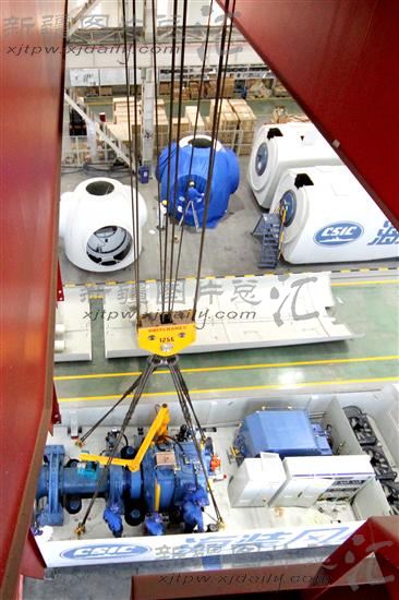 2013年12月5日,新疆哈密海装风电制造基地车间,工作人员在吊装风机机组。