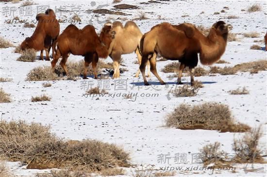 2013年12月14日,新疆哈密的戈壁上骆驼在雪地里觅食。