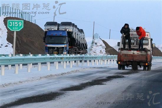 2013年12月14日,公路养护工人在G30高速公路上抛撒防滑沙。