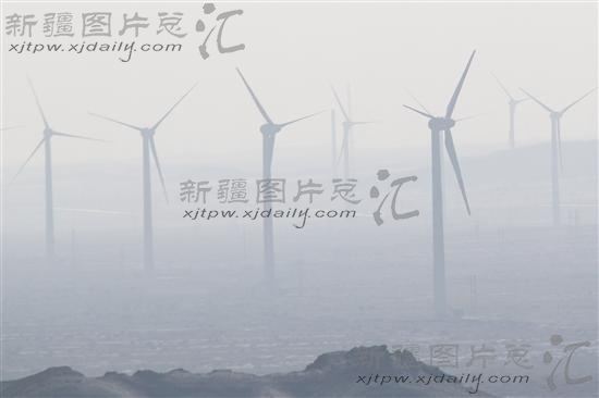 4、12月14日,新疆哈密七角井,雪雾中的风力发电场。