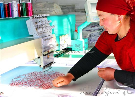 2013年1月4日,新疆阿勒泰市达那外贸有限公司的员工在车间操作机械,给外国客商赶制民族刺绣产品。目前阿勒泰市有刺绣协会10余个,刺绣合作社1个,创业就业基地1个,拥有会员400余名。刺绣从以前的手工转入机械化,产品远销国内外市场。从事刺绣生产人员月收入在2000元以上,直接带动从业妇女增收致富。