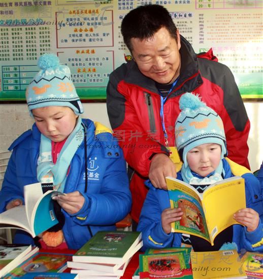 2013年1月11日,新疆塔城地区沙湾县志愿者王继忠在帮牛圈子牧场贫困学生挑选课外书。当日,沙湾县志愿者将该县“顾海英爱心工作室”募捐的50本价值一千多元的哈萨克文课外图书,送到了牛圈子牧场贫困学生的手中。