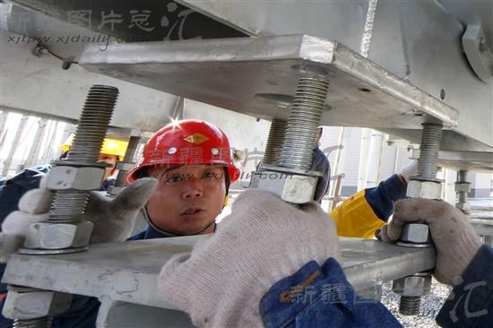 2013年12月14日,电力工人在百里风区——新疆哈密十三间房风区220千伏七角井变电站为风电接入安装设备。