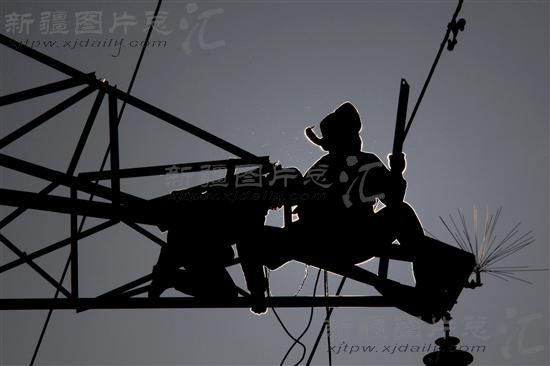 2013年12月14日,电力工人在百里风区——新疆哈密十三间房风区为刚建好的风电场架设导线。