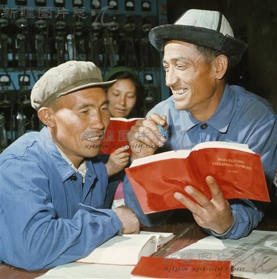 1974年4月,克孜勒苏柯尔克孜自治州,木沙司马义和工人一起学习毛泽东著作。