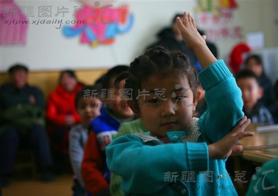 2013年12月20日,新疆博乐市第一幼儿园,一名幼儿在举手回答老师提问。