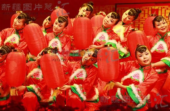 2013年2月1日,演员在表演舞蹈《红灯笼》。当日,新疆昌吉回族自治州阜康市天池管委会举行迎新春文艺汇演,各族职工自编自演了舞蹈、时装秀等节目,展现了管委会职工们的精神风貌。