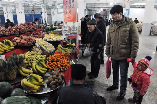 2013年12月18日,市民在伊宁市东城区就业市场购买水果。