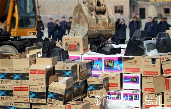 2008年3月14日,新疆乌鲁木齐市市政养护处分会场,标值17万元的700台索尼、LG电视机,DVD、燃气具等假冒伪劣商品被挖掘机砸碎销毁。
