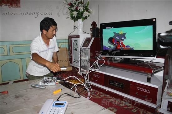 2013年8月15日,岳普湖县广播电视工作人员在调试电视屏幕。