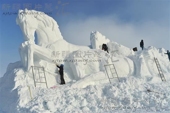 12月25日,巴里坤哈萨克自治县,工人在制作雪雕“马到成功”。