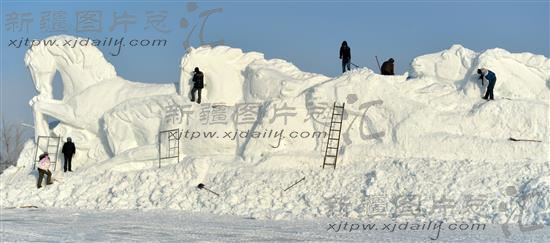 12月25日,巴里坤哈萨克自治县,工人在制作雪雕“马到成功”。
