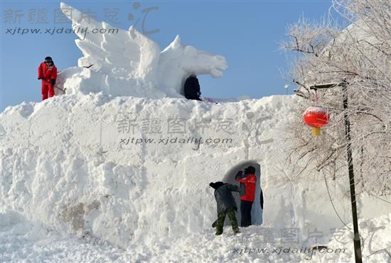 12月25日,巴里坤哈萨克自治县,工人在制作雪雕“天马迎春”。