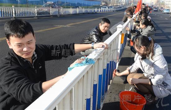 2013年3月5日,来自乌鲁木齐市城管委(行政执法局)直属的12家单位的近百名青年志愿者,在BRT3号线沿线擦洗两边的护栏,以实际行动践行雷锋精神。