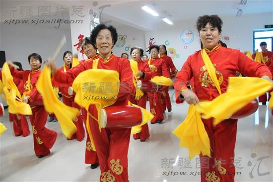 2013年12月18日,博乐市小营盘镇“天使演出队”队员在社区练习腰鼓。
