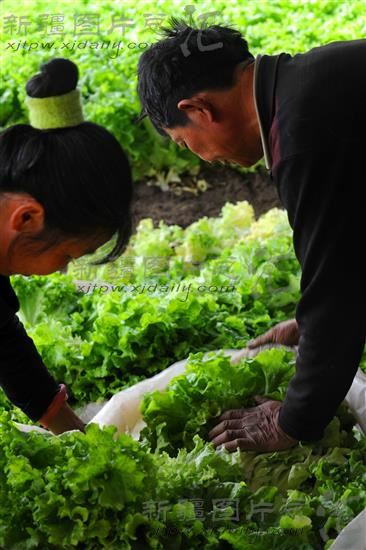2013年3月23日,新疆库尔勒市英下乡菜农在蔬菜大棚里包装叶菜。连日来,库尔勒市英下乡万亩蔬菜生产基地叶类菜陆续批量上市,对稳定蔬菜价格起到一定作用。目前,在库尔勒市各大菜市场上市的本地叶类菜包括上海青、香菜、菠菜、小白菜、莴笋等。