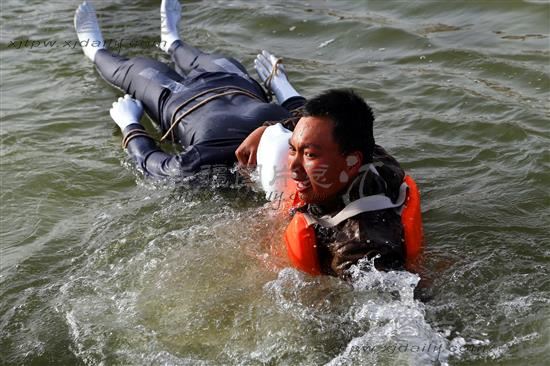 2013年3月19日,南疆军区某工兵团三连班长谭永智在练习水上救护。连日来,该团结合驻地气温回升,山区大量积雪迅速融化易发生汛情的实际,未雨绸缪抓动员,不断加强抗洪救灾方案演练。