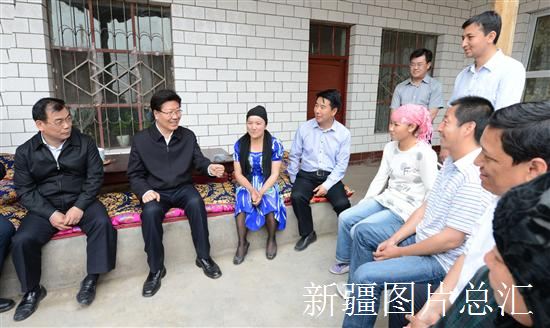 )5月3日,中共中央政治局委员、自治区党委书记张春贤在拜城县乌尊镇村民阿依先木家和村民们座谈。