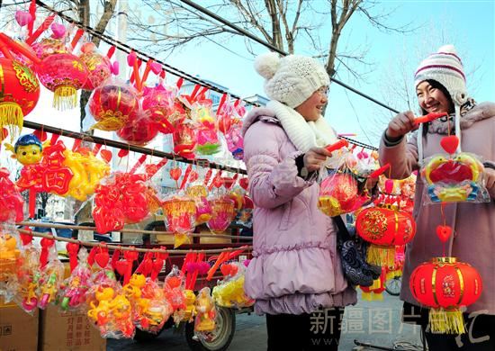 2012年1月28日,两名女孩在新疆塔城市新华街挑选花灯。元宵佳节将至,花灯开始热销,塔城市各商家摆出的各式各样的花灯,吸引了众多市民选购。