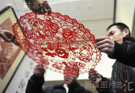 2012年1月6日,工作人员在布置剪纸展。当日,新疆乌鲁木齐市沙依巴克区举办迎新春非物质文化遗产展,希望更多的人关心、关注非物质文化遗产。据了解,2011年11月,沙区选出的“微雕”“剪纸”两个项目被列入自治区第三批非物质文化遗产。