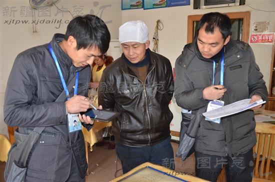 2014年1月6日,新疆生产建设兵团第一师二团的经济普查员,在用PDA移动终端设备采集个体商户的相关信息。