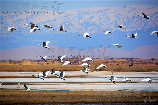 2013年4月6日,百余只天鹅展翅飞翔。当日百余只天鹅在新疆阿勒泰地区哈巴河县吐鲁库勒湿地飞翔、嬉戏、觅食,成为当地一道美丽风景。