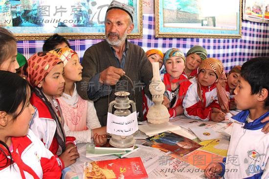 2013年4月2日,吐尔逊·库尔班向学生介绍自己在上世纪六七十年代使用的生活用品。新疆克孜勒苏柯尔克孜自治州阿图什市阿扎克乡阿扎克村71岁的“土喇叭”宣讲员吐尔逊·库尔班的农家书屋书架里整齐摆放着各种书籍、报刊和杂志,书架上还摆放着各式老旧煤油灯、磨刀石、木质拉面盘等生活用品。老人摆放这些陈旧用品,是为了让前来看书学习的人对过去和现在生活有个对比,通过对比来教育大家要倍加珍惜现在的幸福生活。