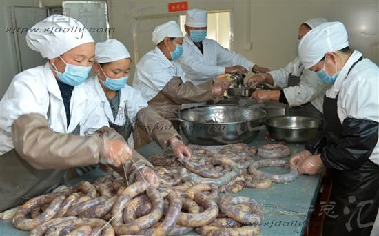 2014年1月7日,新疆巴里坤哈萨克自治县,工人在厂房里加工制作熏马肠。