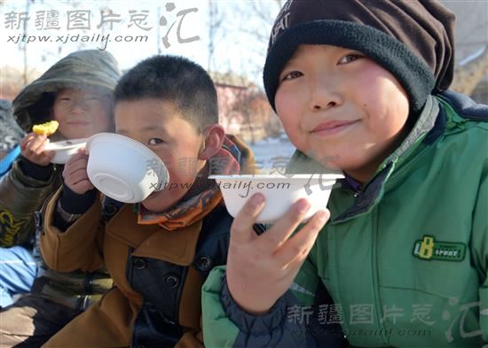 1月8日,巴里坤哈萨克自治县地藏寺,品尝腊八粥的儿童。
