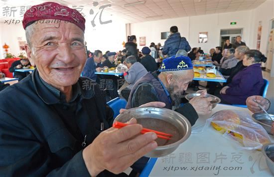 1月8日,巴里坤哈萨克自治县,福利院的老人在品尝腊八粥。