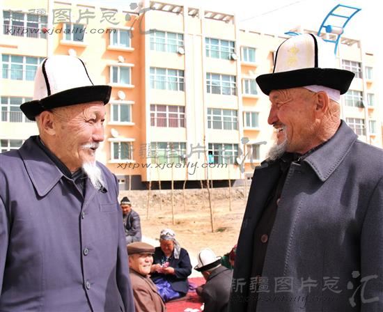 2013年4月8日,新疆克孜勒苏柯尔克孜自治州乌恰县托云乡牧民卡迪尔·阿吉(右)和依斯拉木·努肉孜巴依在阿依布拉克牧民定居小区畅谈乌恰新变化。近年来,乌恰县不断加快“安居富民、定居兴牧”工程步伐,目前已有3000余户牧民走出大山进城住上了新楼房。
