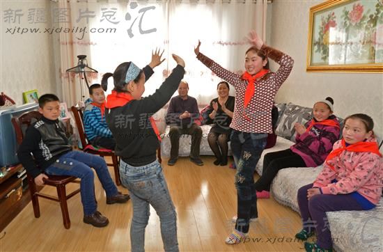 1月9日,哈萨克族小学生阿拉依(中)在自家的客厅里教新结识的汉族小朋友跳民族舞。