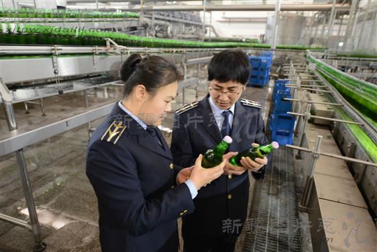 2014年1月10日,新疆阿拉尔质量技术监督局的工作人员在燕京啤酒(阿拉尔)有限公司检查灌装啤酒的生产质量。