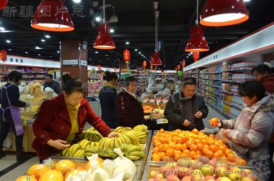 2014年1月10日,顾客在新疆生产建设兵团第五师八十六团新开业的一家占地面积为2000平米的大型连锁超市选购年货。