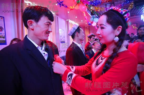 当天,新疆喀什地区巴楚县恰尔巴格乡为20对农村青年举办集体婚礼。