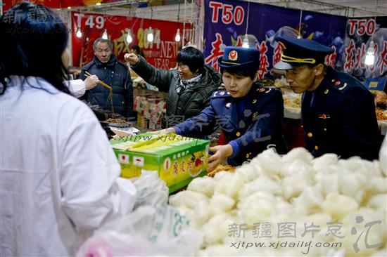 2014年1月12日,在新疆国际会展中心,乌鲁木齐市水磨沟区工商局七道湾工商所执法人员,在第七届新春年货博览会现场进行检查。