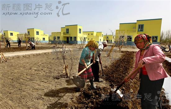 2013年3月24日,新疆喀什地区莎车县米下乡农民在富民安居点前广场种植万寿菊。