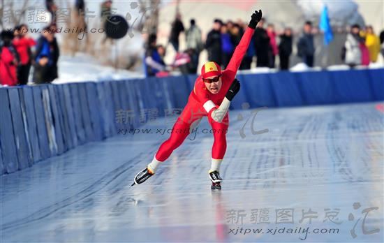 2014年1月25日,克拉玛依市代表队的运动员田芮宁在比赛中。最终,田芮宁以42秒50的成绩摘得女子甲组500米速度滑冰比赛第一名。