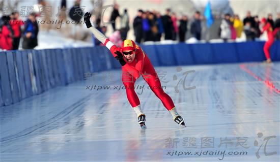 2014年1月25日,克拉玛依市代表队的运动员田芮宁在比赛中。最终,田芮宁以42秒50的成绩摘得女子甲组500米速度滑冰比赛第一名。
