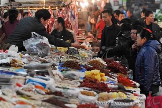 2014年1月25日,市民在新疆库尔勒市孔雀市场选购调味品。