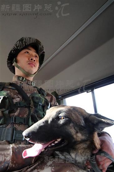 2014年1月25日,边防连战士带着军犬乘坐巡逻车在边境线上执勤。