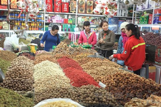 2014年1月25日,新疆哈密市丰茂市场,顾客在选购干果。