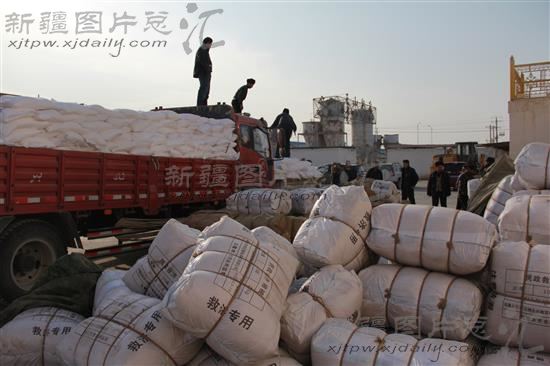 2014年1月25日,新疆岳普湖县,工作人员在分发新春物资。